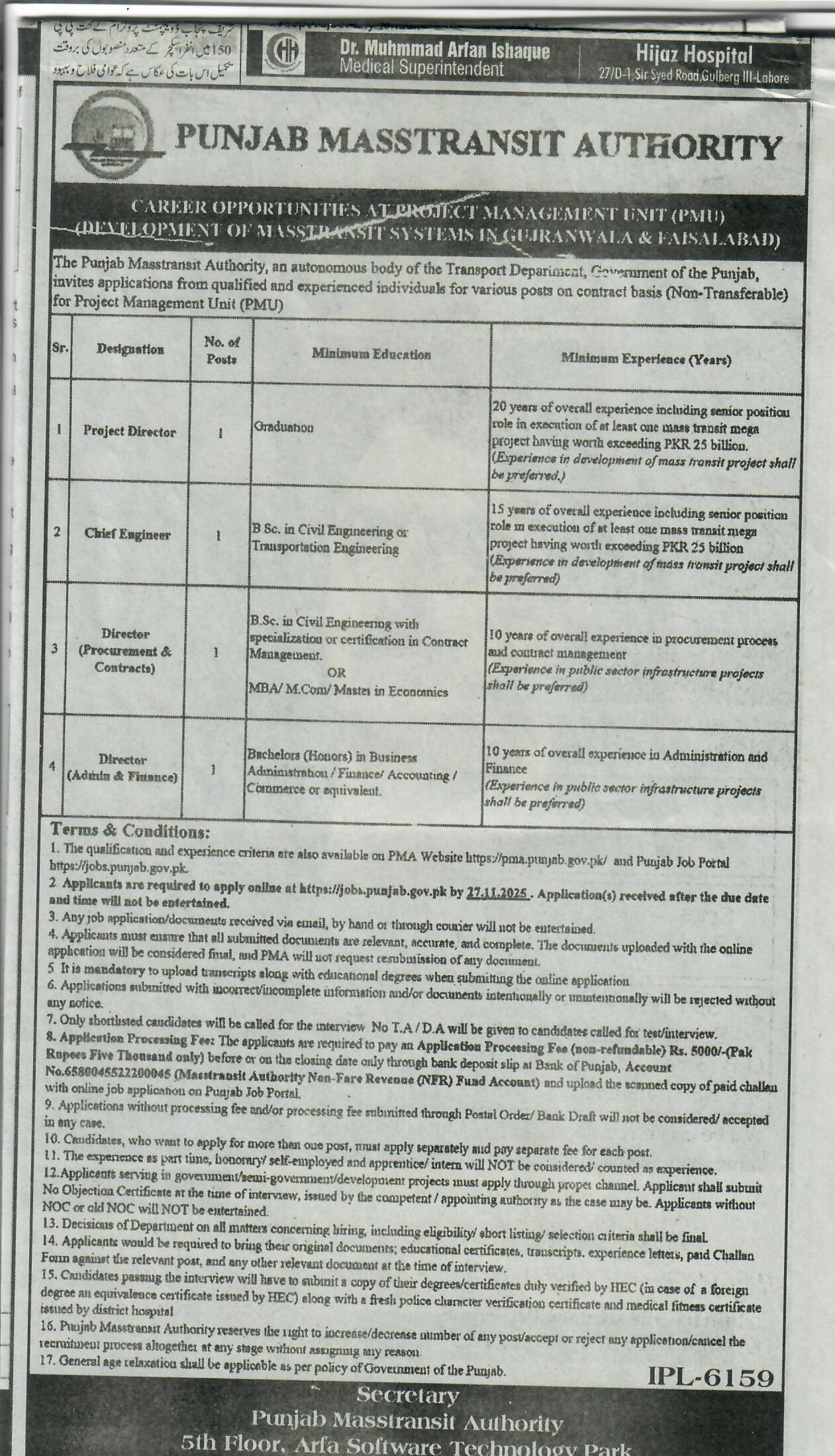The Punjab Masstransit Authority (PMA) has announced multiple government jobs in Lahore, offering exciting career opportunities for skilled and qualified individuals. These latest government jobs in Lahore have become available in various departments, and the application process is online through the Punjab Job Portal. Applications shall be received online till 27 November 2025. The Advertisement for these jobs is published in the Jang Newsapper dated 12 November 2025