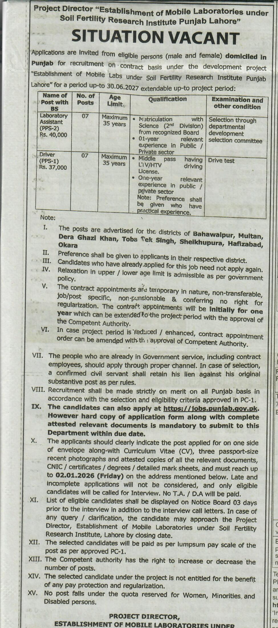 The establishment of mobile laboratories under the soil fertility research institute, Punjab, Lahore has made it possible for the new job openings in Lahore for those who will be qualified and eligible candidates. The project is aimed at upgrading Punjab’s soil testing and agricultural research quality, hence, the candidates looking for jobs in Lahore, especially those jobs related to the government project, are encouraged to apply before the closing date. Applications are invited for two positions, namely Laboratory Assistant (PPS-2) and Driver (PPS-1).