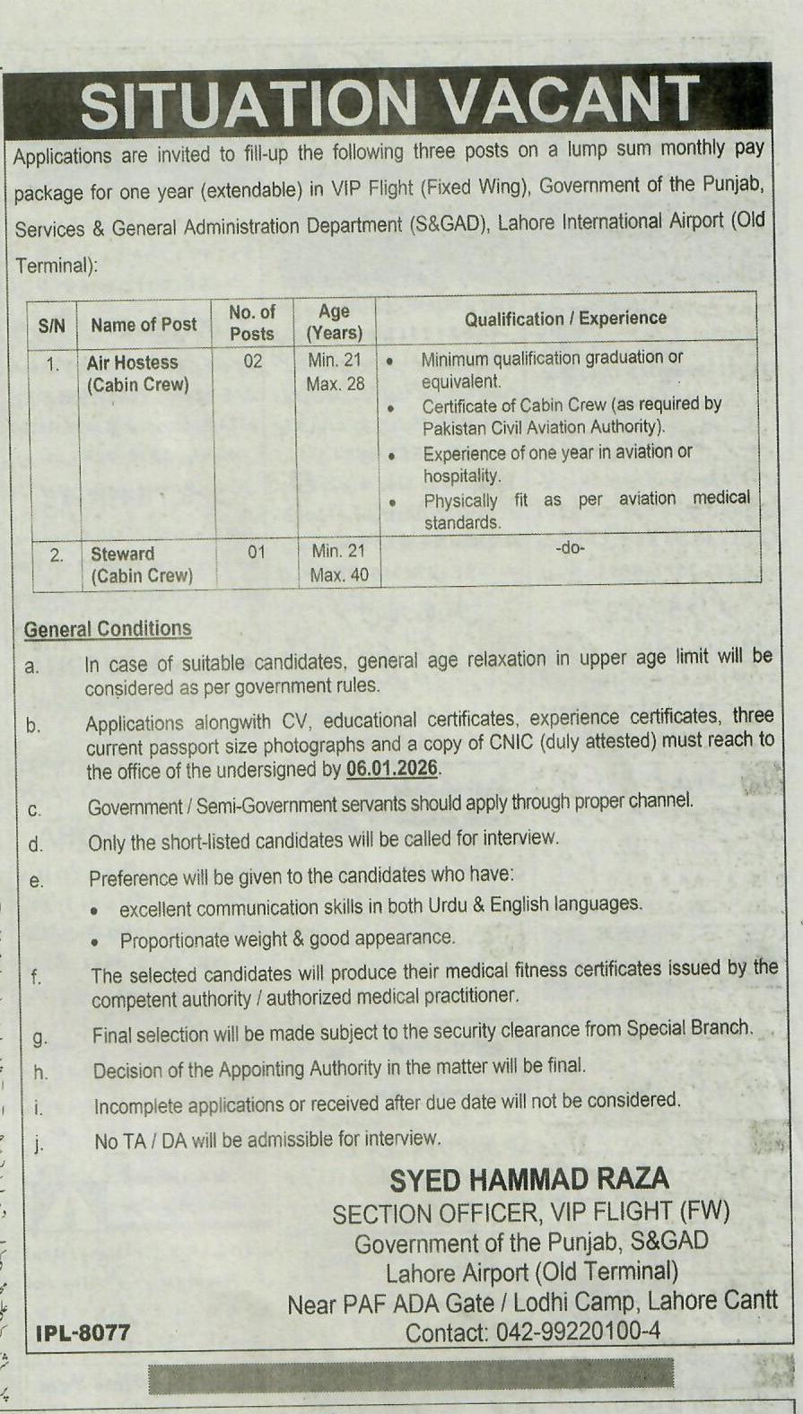 Applications are invited to fill up the three posts on a lump sum monthly pay package for one year (extendable) in VIP flight (Fixed Wing), Government of the Punjab, Service and General Administration Department (S&GAD), Lahore International Airport (Old Terminal)