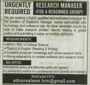 We are looking for enthusiastic and competent candidates for the position of Rsearch Manager at Renowned Group. The job has great career opportunities, lucrative salary deals, and a professional workplace.