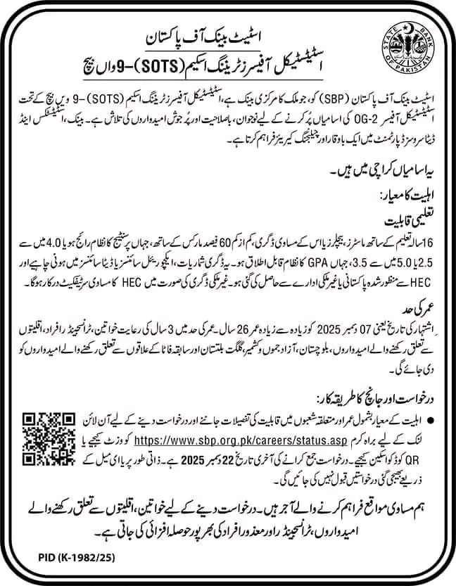 State Bank of Pakistan (SBP) believes in attracting and retaining talent to meet its human resource requirements through a transparent recruitment process. Appointments under SOTS batches are made in OG-2 Grade as per organizational need strictly on merit and as per provincial/ regional quota, prescribed by the Federal Government.
